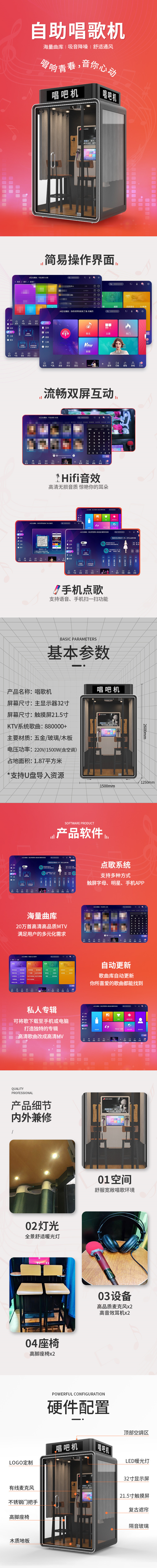產(chǎn)品特點:這款豪華版唱吧機(jī)箱是采用的半掛形式,整體看起來非常美觀大氣,占地面積1.87平方米。KTV系統(tǒng)歌曲88萬+,支持U盤導(dǎo)入歌曲,不定時更新曲目,可手機(jī)點歌 支持語音、手機(jī)掃一掃功能,HIFI音效 高清無損音質(zhì) 驚艷你的耳朵!