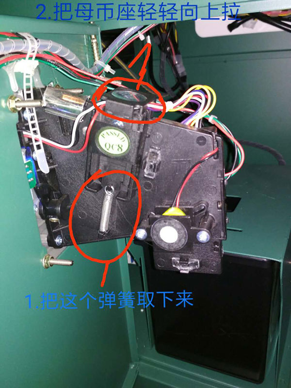 1.先把投幣器彈簧取出,投幣座往上拉