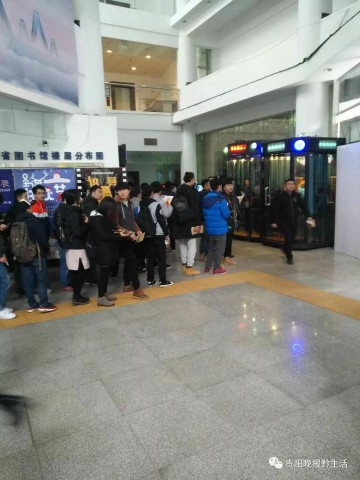 12月12日,盡管天氣寒冷,貴州省圖書館門口,人們排著長隊,等候體驗設在貴州省圖書館大廳里的朗讀亭。
