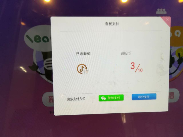 第二步:選擇付費(fèi)方式“投幣支付”,“微信支付”或者“積分支付”,投幣支付只需要在主機(jī)柜下方投幣口投幣即可,點(diǎn)擊微信支付會(huì)彈出二維碼,掃描支付即可開(kāi)啟你的點(diǎn)唱之旅。