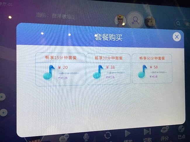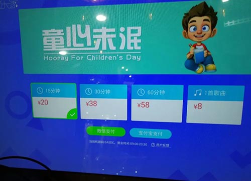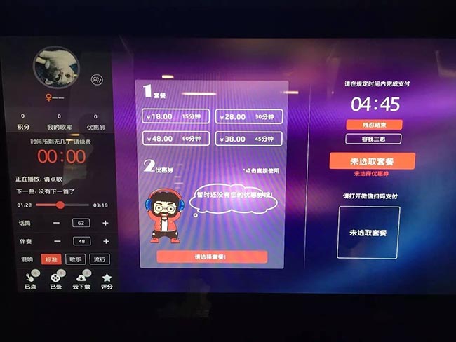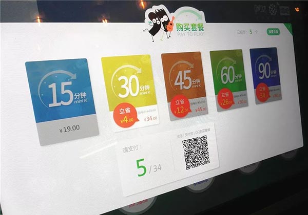 迷你自助ktv唱吧怎么收費?多少錢一小時?掃描二維碼登錄后發現,每臺機器每天有著限定的免費試唱名額,名額用完后,只能試唱更短的時間,如果還想繼續唱歌就要充值。屏幕上顯示,一首歌曲付費5元,包時15分鐘20元,一小時64元。