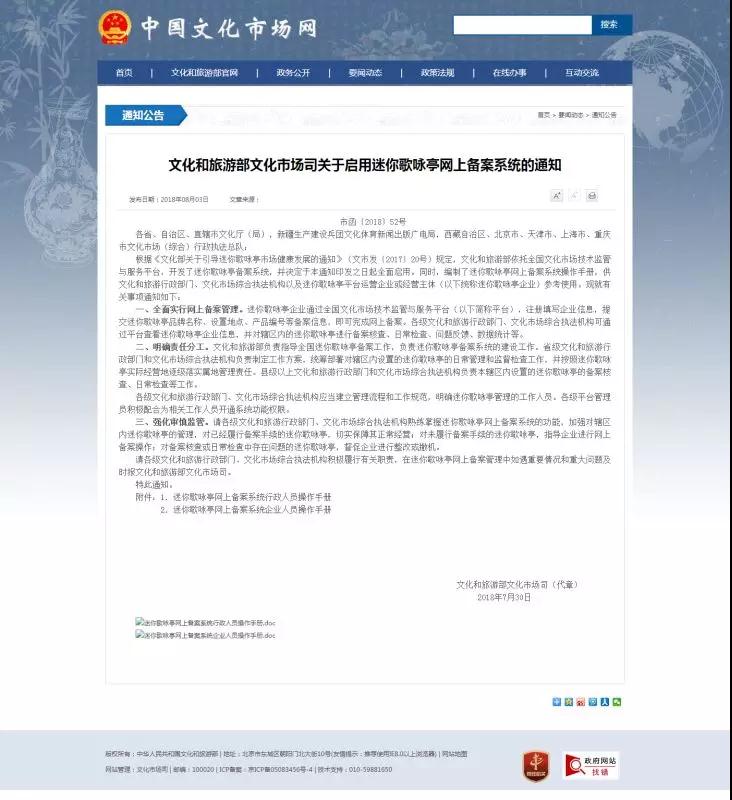 與此同時,也出現(xiàn)了設(shè)備安全難保障、衛(wèi)生環(huán)境較差、歌曲內(nèi)容違規(guī)或者侵權(quán)等問題,針對這些問題,2017年,文化和旅游部發(fā)布了《文化部關(guān)于引導(dǎo)迷你歌詠亭市場健康發(fā)展的通知》,全面規(guī)范了迷你歌詠亭市場,近日,文化和旅游部文化市場司印發(fā)了《關(guān)于啟用迷你歌詠亭網(wǎng)上備案系統(tǒng)的通知》,通知要求各相關(guān)部門全面實行網(wǎng)上備案管理,并明確了權(quán)責分工,規(guī)范了迷你歌詠亭的日常管理和監(jiān)督檢查工作。此消息一出,一石激起千層浪。