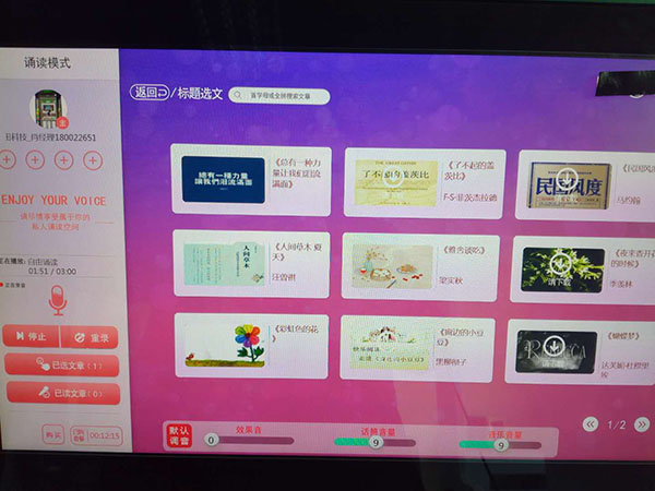 二,錄音房點歌系統出色,重新開發的朗讀亭,簡潔化的選歌界面,多樣化的朗讀材料,精細化的操控平臺,都為用戶提供更好的朗讀服務;